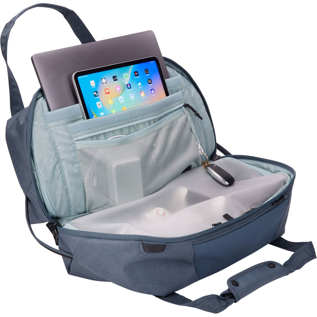 The dark slate, 35L Aion Duffel bag from Thule has a divider that creates two compartments, so it's easy to keep everyday items separate from outdoor gear. The TPU-lined compartment locks in odor, dirt, and moisture, making it great for dirty clothes or damp sportswear. The duffel has sleeves for a 16" laptop and a 12.9" tablet. A trolley sleeve allows you to attach it to the handle of your rolling luggage .