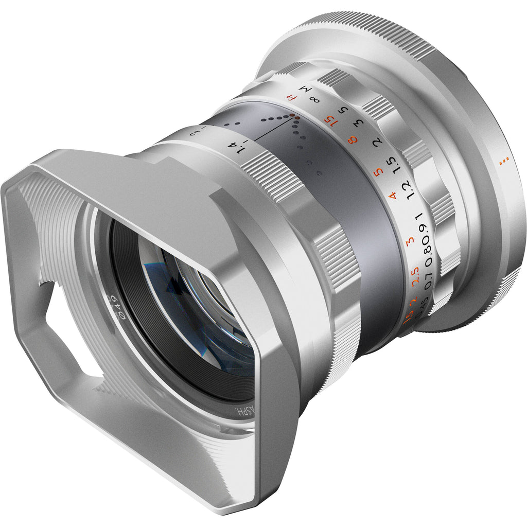 Designed in homage to the legendary Kern Macro-Switar lens for Alpa 35mm cameras, the silver Canon RF-mount Thypoch Simera 35mm f/1.4 Lens has bright, low-light friendly optics in a sleek aluminum housing for high-quality imagery in a wide range of shooting scenarios. Its large aperture enhances depth of field effects including bokeh and subject-background separation. Featuring a declickable aperture ring and a grooved focus tab, the manual focus design is both tactile and wieldy. The optical design features three high-refractive index elements and an aspherical element for clarity from the center to the edge of the frame.