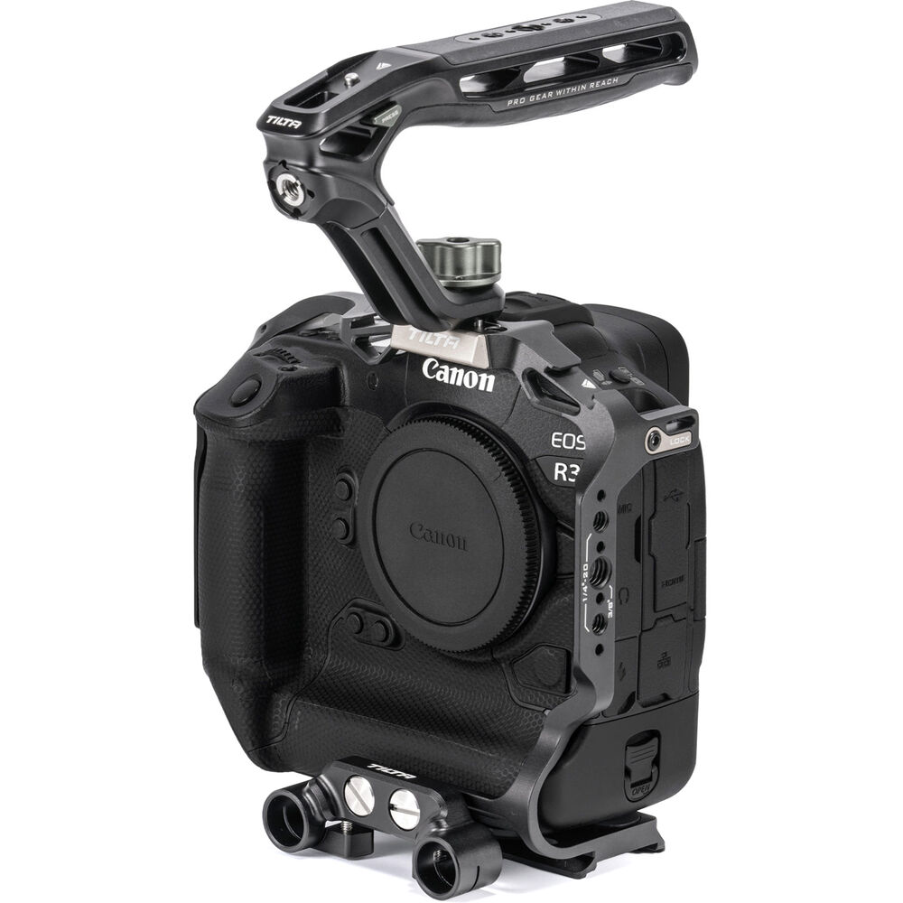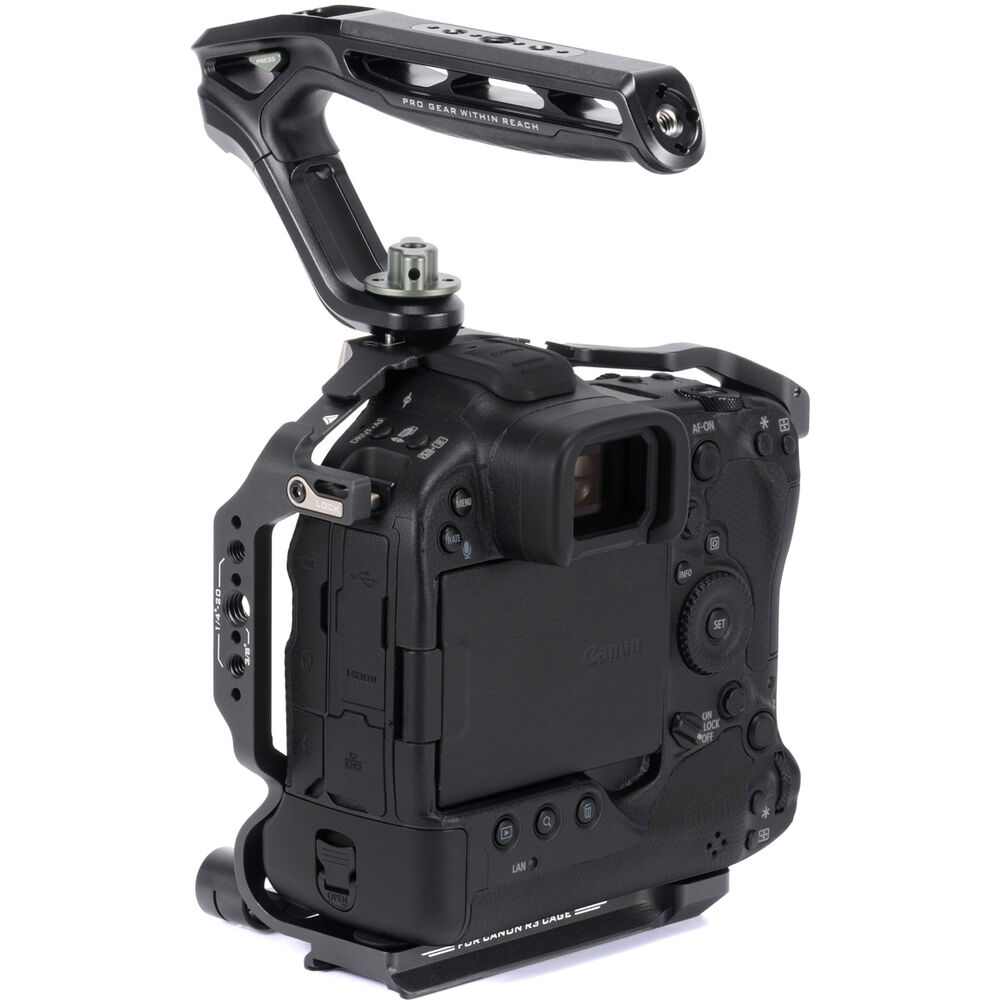 Protect your Canon EOS R3 camera and add mounting options using this Basic Full Camera Cage Kit from Tilta. Included in the bundle are a full camera cage, a top handle with a 1/4"-20 locating screw, and a dual 15mm rod block. All these pieces work to improve your camera rig's compatibility and connectivity.