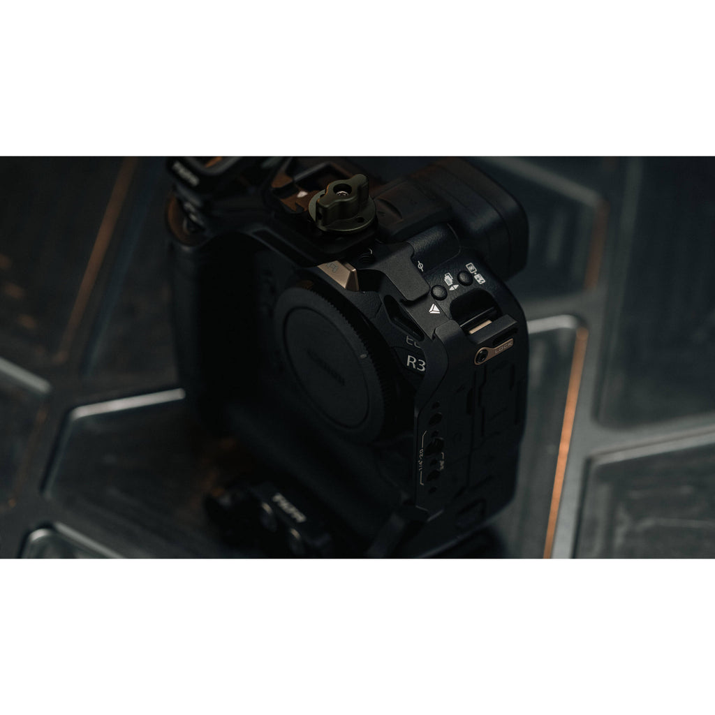 Attach this Tilta Full Camera Cage to your Canon EOS R3 camera to expand its mounting options and protect the device. Multiple 1/4"-20 and 3/8"-16 threads, as well as two cold shoe mounts, allow you to mount articulating arms and wireless microphones to the cage. Threads at the front of the cage allow you to attach a separately available 15mm rod block.