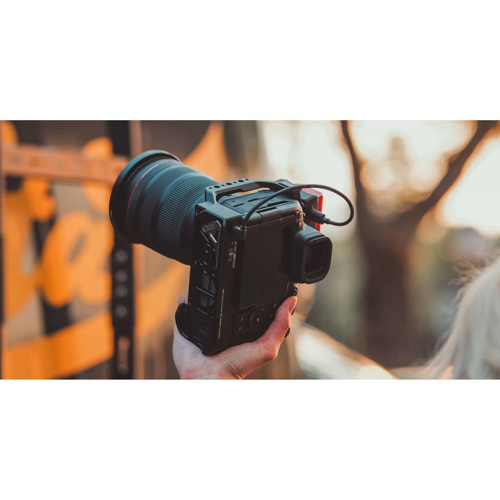 The Tilta Camera Cage Base Kit with Cooling System for the Canon EOS R5 Mark II enhances performance, protection, and customization. Its intelligent cooling system prevents overheating, while multiple mounting points support various accessories. The included Xeno Top Handle provides a stable grip for low-angle shots and features multiple thread points and a cold shoe mount for additional attachments. With a lightweight yet durable design, this cage ensures secure camera operation without unnecessary bulk. Overall, it's a versatile solution for filmmakers and photographers looking to optimize their Canon EOS R5 Mark II setup.