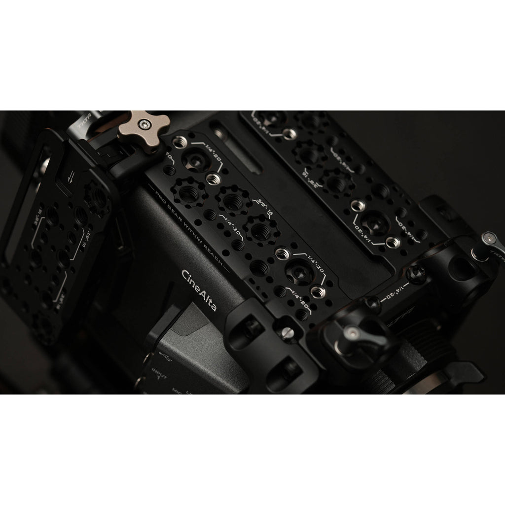The top handle slides into the top plate slot with two screws and provides additional 1/4"-20 and 3/8"-16 accessory threads, and it is also compatible with the original Sony top handle. The side plate can also adjust its angle and height for added versatility. You can mount the baseplate on a separately available Tilta dovetail using its 1/4"-20 and 3/8"-16 bottom threads.