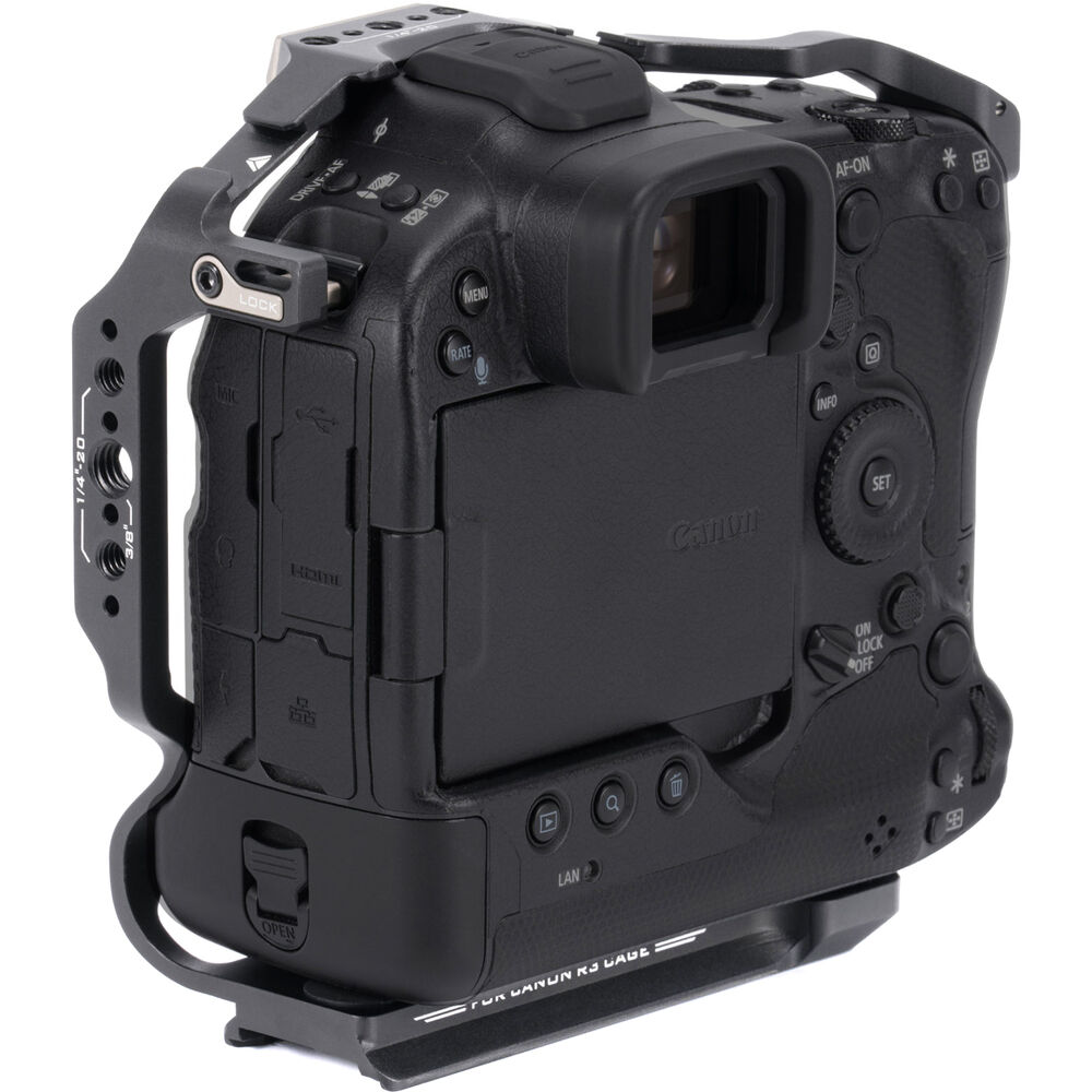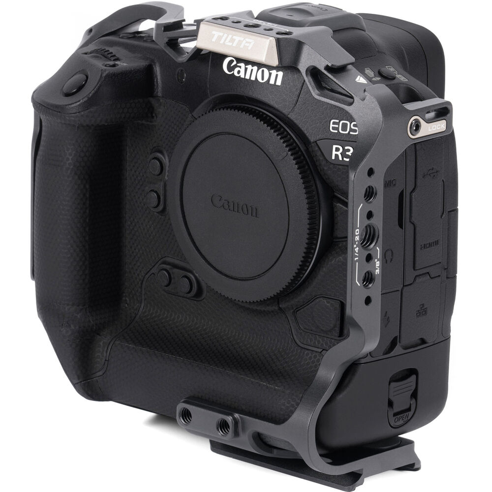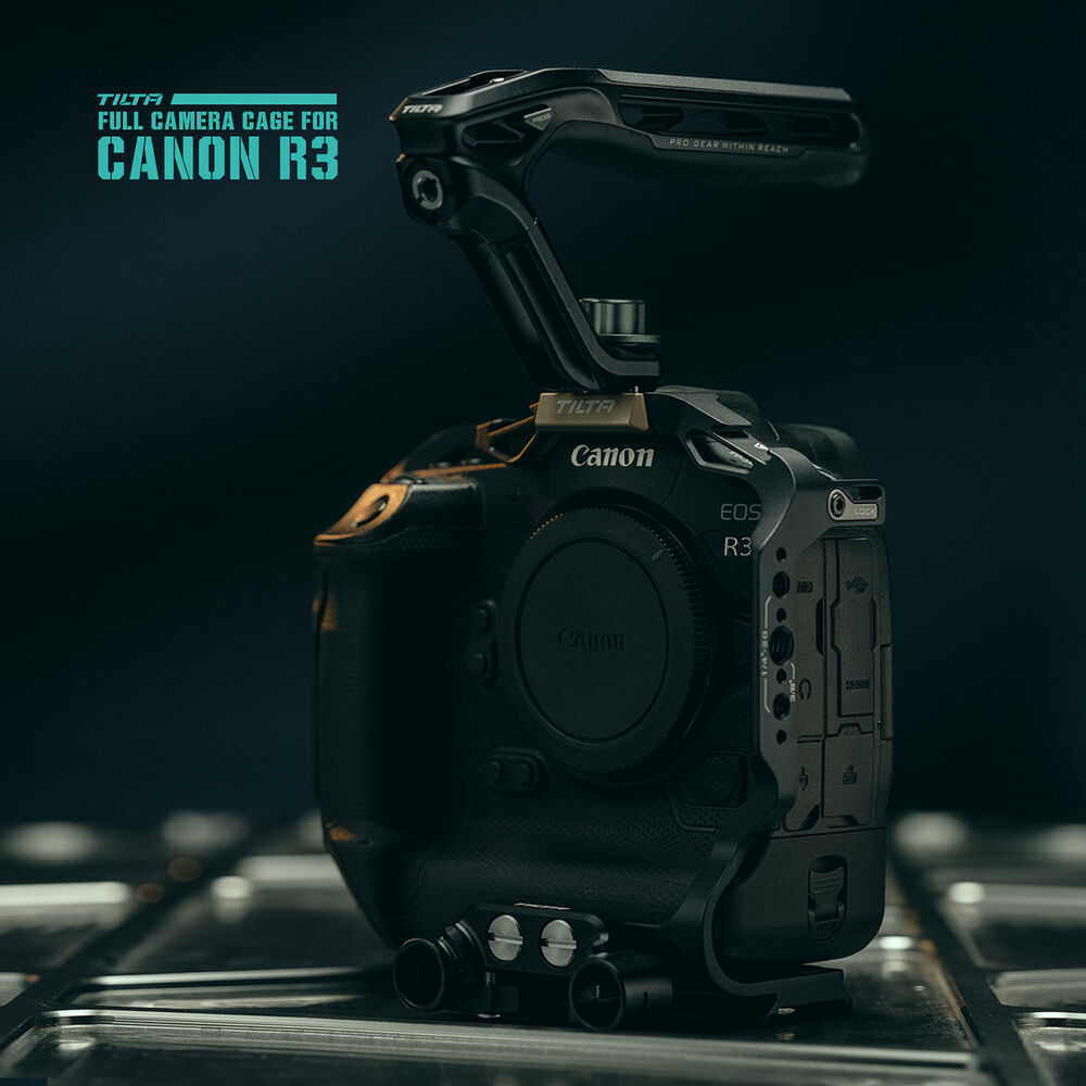 Attach this Tilta Full Camera Cage to your Canon EOS R3 camera to expand its mounting options and protect the device. Multiple 1/4"-20 and 3/8"-16 threads, as well as two cold shoe mounts, allow you to mount articulating arms and wireless microphones to the cage. Threads at the front of the cage allow you to attach a separately available 15mm rod block.