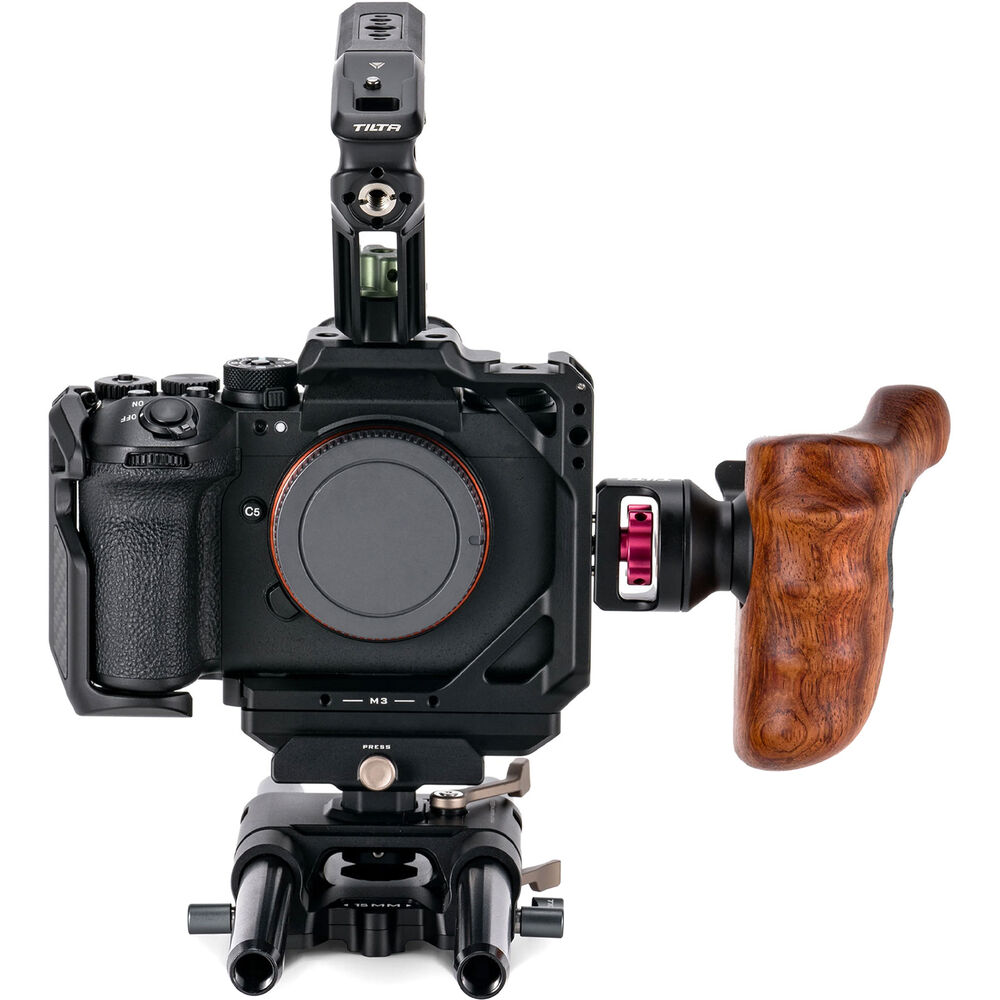 A professional set of mounting options for the Sony a1 II and a9 III mirrorless cameras, the Full Camera Cage Pro Kit from Tilta combines the full camera cage with a top handle, an Arca-type adjustable baseplate, a pair of 7.8" 15mm aluminum rods, and a left-side wooden grip with a 1/4"-20 screw attachment.