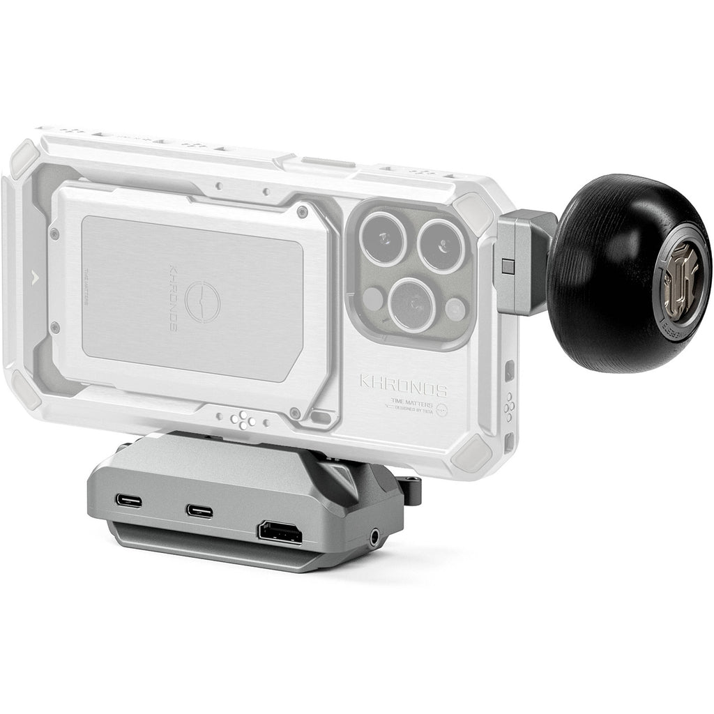 Add this titanium white Khronos Circular Wooden Handle from Tilta to enhance your Khronos cage with a solid grip. Part of the optional Ultimate Kit, the wooden handle mounts onto any side of your Khronos cage using a quick locking clamp, so you can hand hold your iPhone 15 Pro or Pro Max rig for either horizontal or vertical shooting. A smooth, round, wooden design provides a comfortable grip for any hand size.