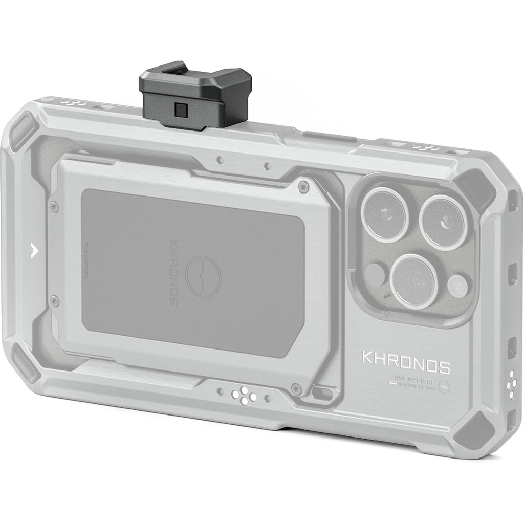 The space gray Khronos Cold Shoe Quick Release Adapter from Tilta is lets you mount traditional camera accessories to your Khronos Case for the iPhone 15 Pro or Pro Max. It features a cold shoe receiver, which is suited for accessories that include on-board boom microphones and external monitors. It secures using a locking clamp and can be easily connected to any of the mounting points on the smartphone case by pressing the release button, aligning the pins, and releasing the button once in place.