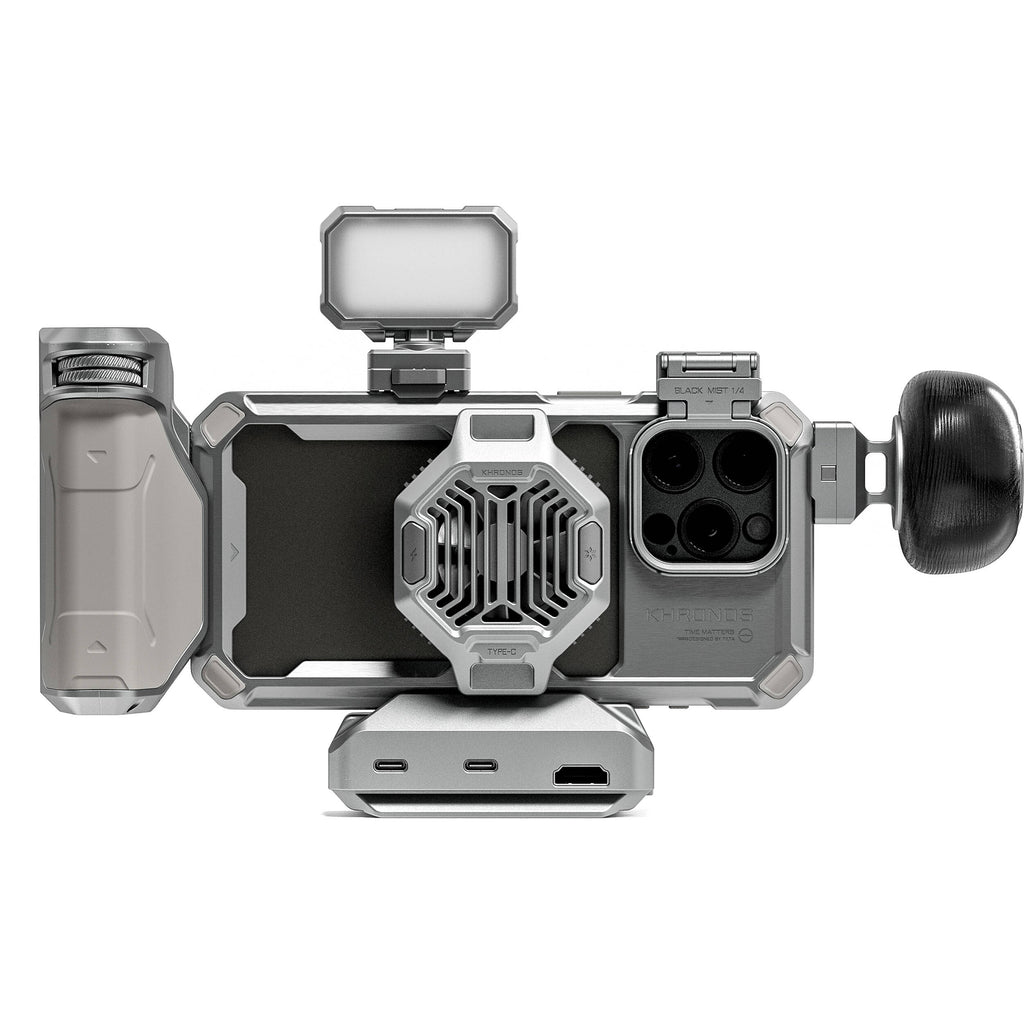 Designed for mobile filmmakers using the iPhone 15 Pro Max, the titanium white Khronos Ultimate Kit from Tilta includes a Khronos iPhone 15 Pro Max Case, a Khronos Cooling System, a Khronos Focus PD Handle, a Khronos Mini Daylight LED Light Panel, a Khronos ARCA Quick Release Adapter (38mm), a Khronos Quick Release USB-C Hub, a Khronos Circular Wooden Handle, a Khronos Universal SSD Holder, a Khronos Quick Release Filter Tray, a Khronos Magnetic FSND 0.6 Filter, a Khronos Magnetic FSND 1.2 Filter, a Khronos Magnetic Black Mist 1/4 Filter, and a Khronos Magnetic White Mist 1/4 Filter. This bundle helps ensure you're better equipped for professional videography, live streaming, vlogging, and more.