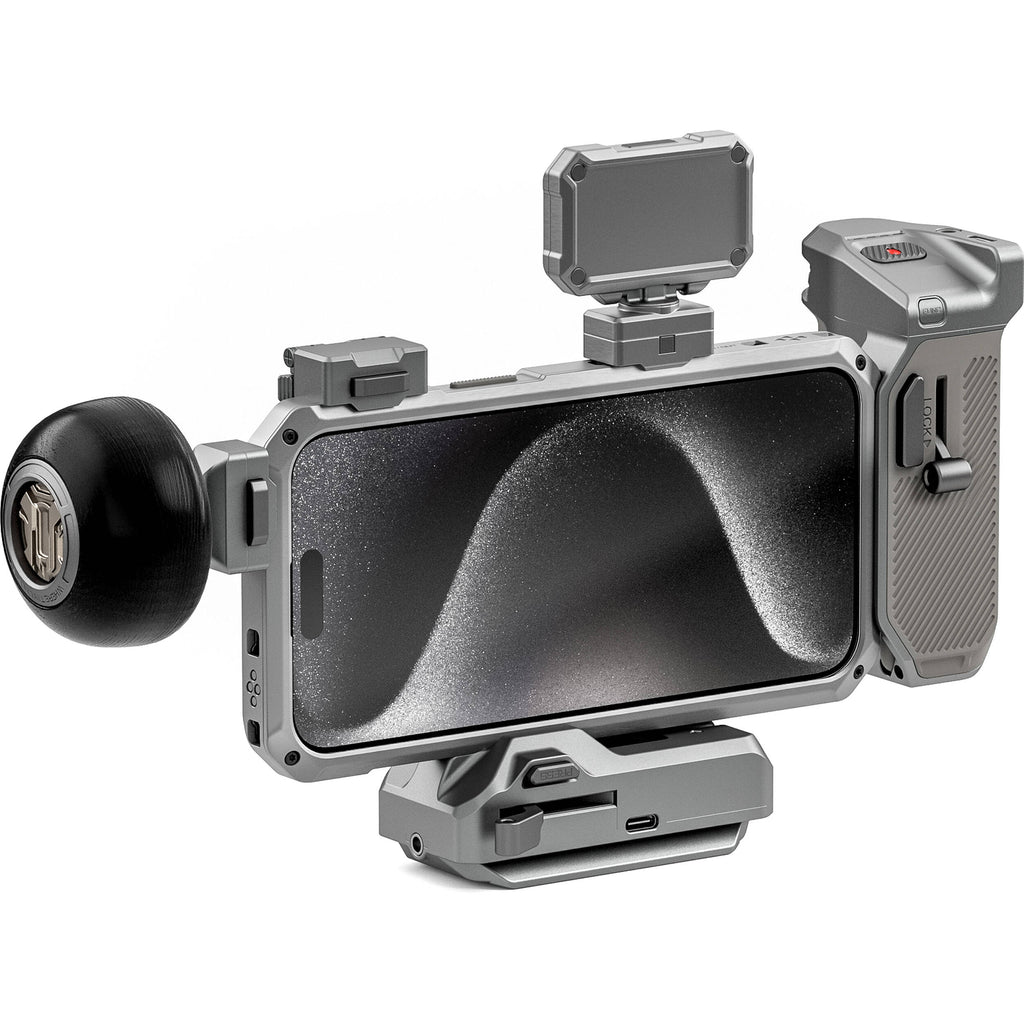 Whether you're shooting a video for a client or capturing an important family event, the titanium white-colored Khronos Mobile Filmmaking Case for iPhone 15 Pro Max from Tilta is the ideal platform for obtaining cinematic results. It's the core of Tilta's Khronos ecosystem, which includes a host of accessories that are designed to let you get the most out of the high-end iPhone 15 cameras. Accessories like the iPhone lens adapter, quick release filter tray, and various filters. Those optional accessories attach to the case via a locking clamp and nine proprietary mounting points. It even has electronic contact points to pass power along the case when using specific attachments, such as the Khronos Power Handle.