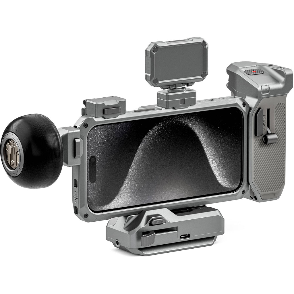 Whether you're shooting a video for a client or capturing an important family event, the titanium white-colored Khronos Mobile Filmmaking Case for iPhone 15 Pro from Tilta is the ideal platform for obtaining cinematic results. It's the core of Tilta's Khronos ecosystem, which includes a host of accessories that are designed to let you get the most out of the high-end iPhone 15 cameras. Accessories like the iPhone lens adapter, quick release filter tray, and various filters. Those optional accessories attach to the case via a locking clamp and nine proprietary mounting points. It even has electronic contact points to pass power along the case when using specific attachments, such as the Khronos Power Handle.