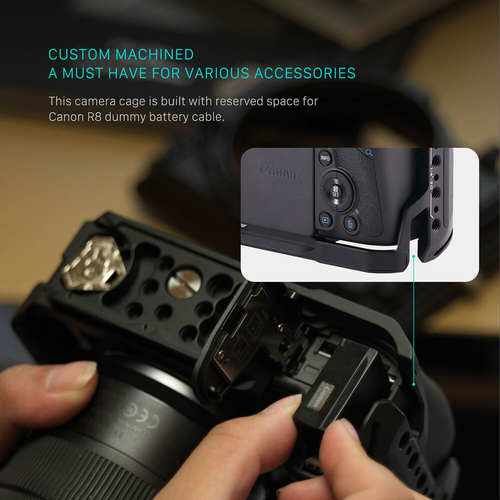 Adding accessories and preventing damage to your Canon R8 mirrorless camera is seamlessly enabled by this black Full Camera Cage from Tilta. Custom-machined from lightweight yet durable aluminum, the cage contains a hidden silicone protection pad to mitigate shock and scratches from the occasional accident. Because it is specifically designed for use with the R8, the cage features cutout sections to maintain access to all the necessary ports and buttons, including a slot for dummy battery cables.