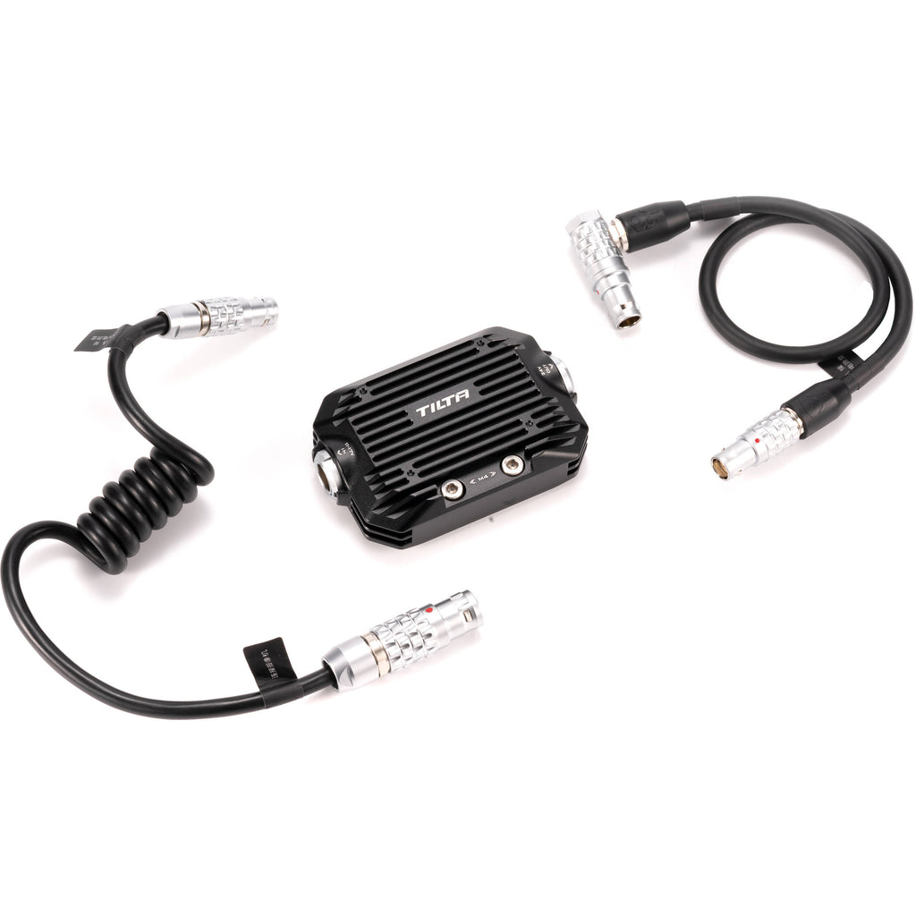Tilta enables you to power an ARRI ALEXA Mini, Mini LF, or other compatible 24V cameras via your gimbal. This module provides a constant 24V 8A power output at a maximum of 100W and has a heat sink for cooling. It includes a coiled 4-pin to 4-pin LEMO cable, a 4-pin to 8-pin LEMO cable, and a hex key.