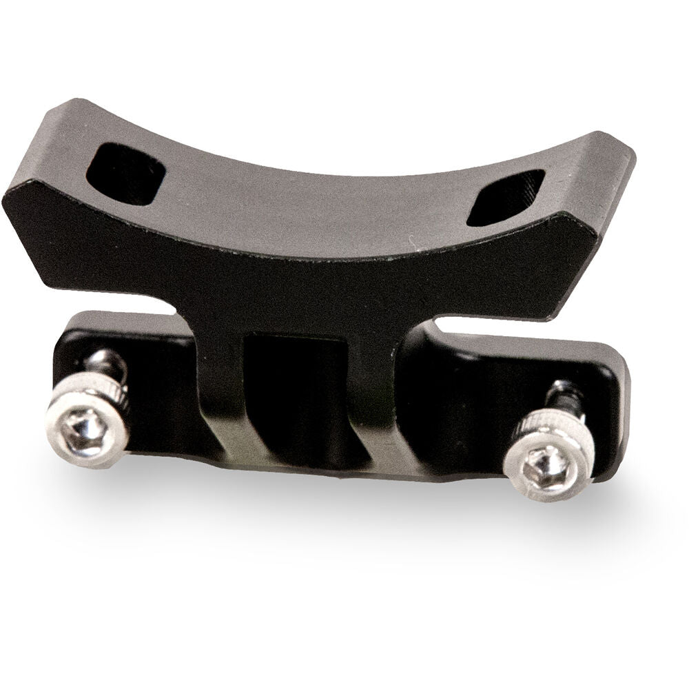 The RF Mount Adapter Support, in black, attaches to the front of the Tilta camera cage for the Canon R5/R6 to provide support for an RF lens mount adapter. The attachment screw holes are slotted to allow a bit of vertical adjustment for compatibility with virtually all adapters.