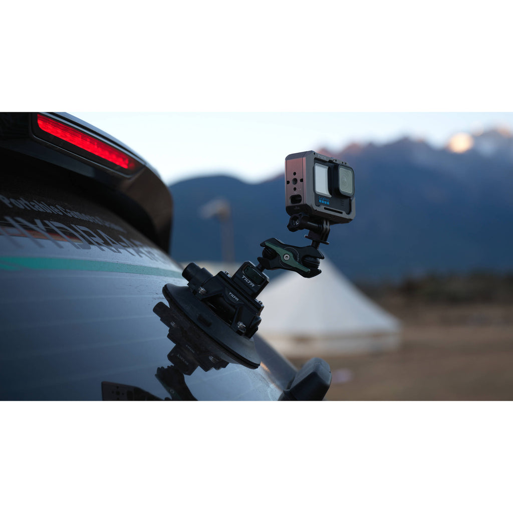 The 4.5" diameter Universal Suction Cup with Mounting Bracket from Tilta features a vacuum pump on the side that allows you to securely attach it to smooth, non-porous surfaces. It's made of rubber and silicone and provides multiple 1/4"-20 threads on top for mounting various devices and accessories, including action cameras such as GoPro HERO, DJI Action, or Insta360.