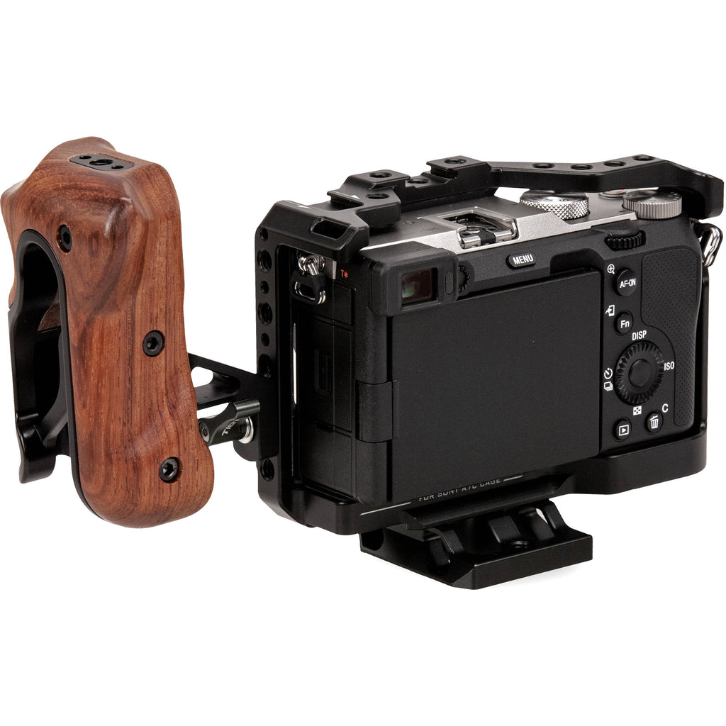 Featuring a black finish and a variety of mounting options, this Tiltaing Camera Cage Kit B from Tilta is designed to provide protection and accessory mounting for your Sony a7C mirrorless camera. The kit includes a full camera cage, a wooden side handle, an advanced handle attachment, and a Manfrotto-style quick release plate.
