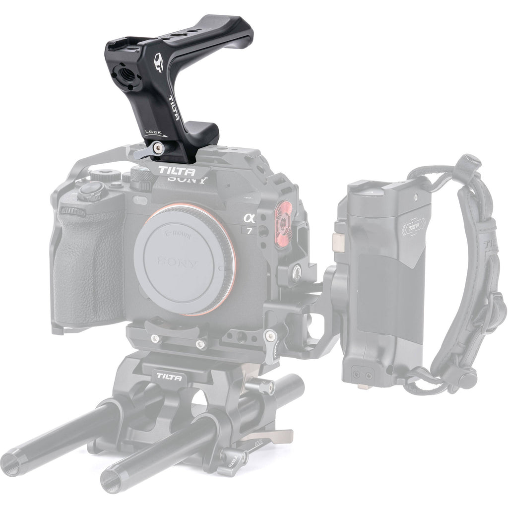 The aluminum and stainless steel handle mounts securely onto a camera cage, such as the Tilta Full Camera Cage for Sony a7 IV, using its NATO clamp and locking lever.
