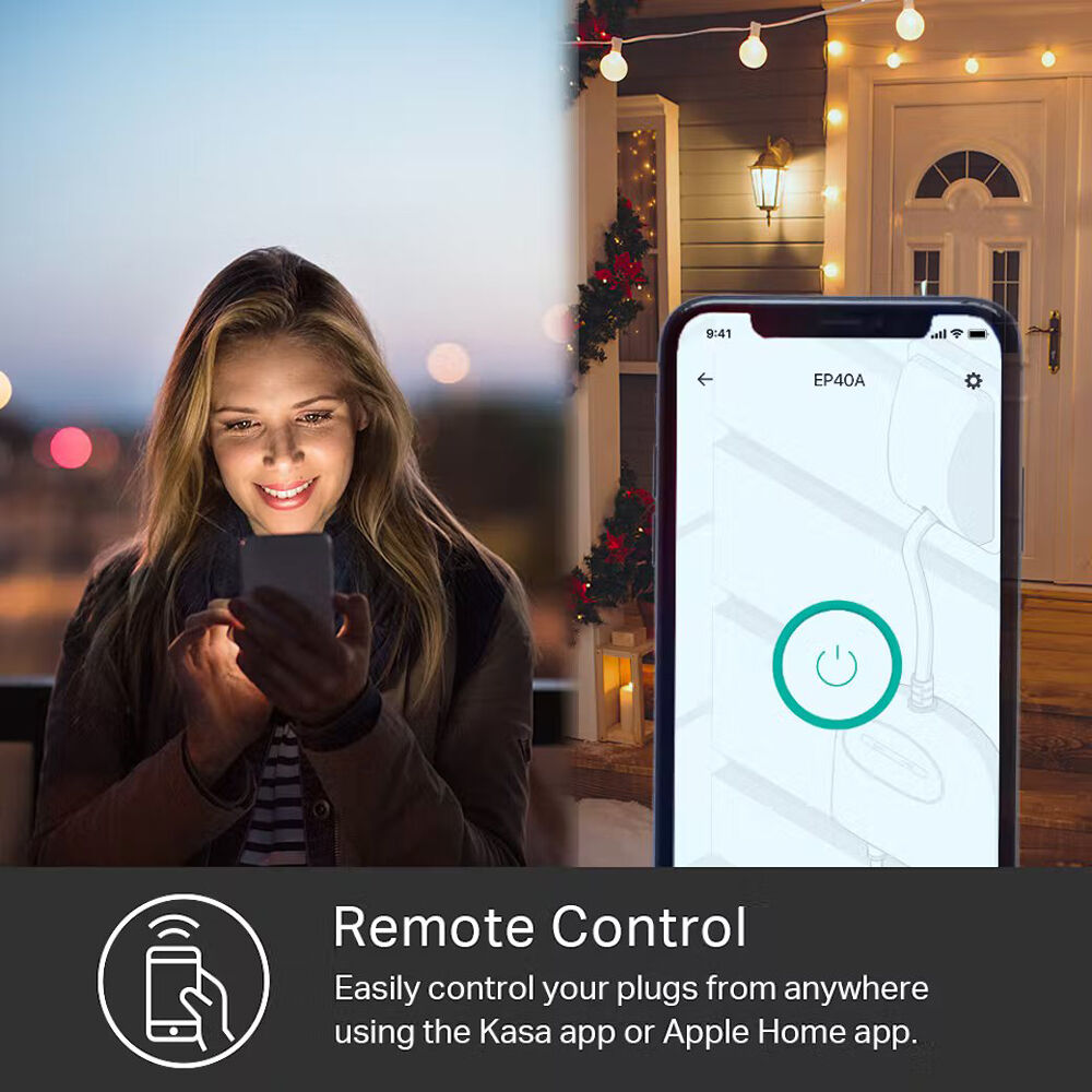 Control up to six outdoor devices from anywhere by plugging them into the EP40A Kasa Smart Outdoor Wi-Fi Plug from TP-Link. Equipped with two individually controllable outlets, the EP40A enables you to turn plugged-in devices on and off. This smart plug connects to your iOS or Android device via Wi-Fi, giving you access to any item plugged into an outlet through the Kasa Smart app.