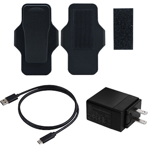 The TS-DBK8 accessory kit from Transcend includes a 360° rotatable clip and a hook-and-loop fastener holder and straps for attaching the DrivePro Body 10C & 40 cameras to your body, along with a power adapter and USB-C to USB-A cable for charging and delivering power to the camera.