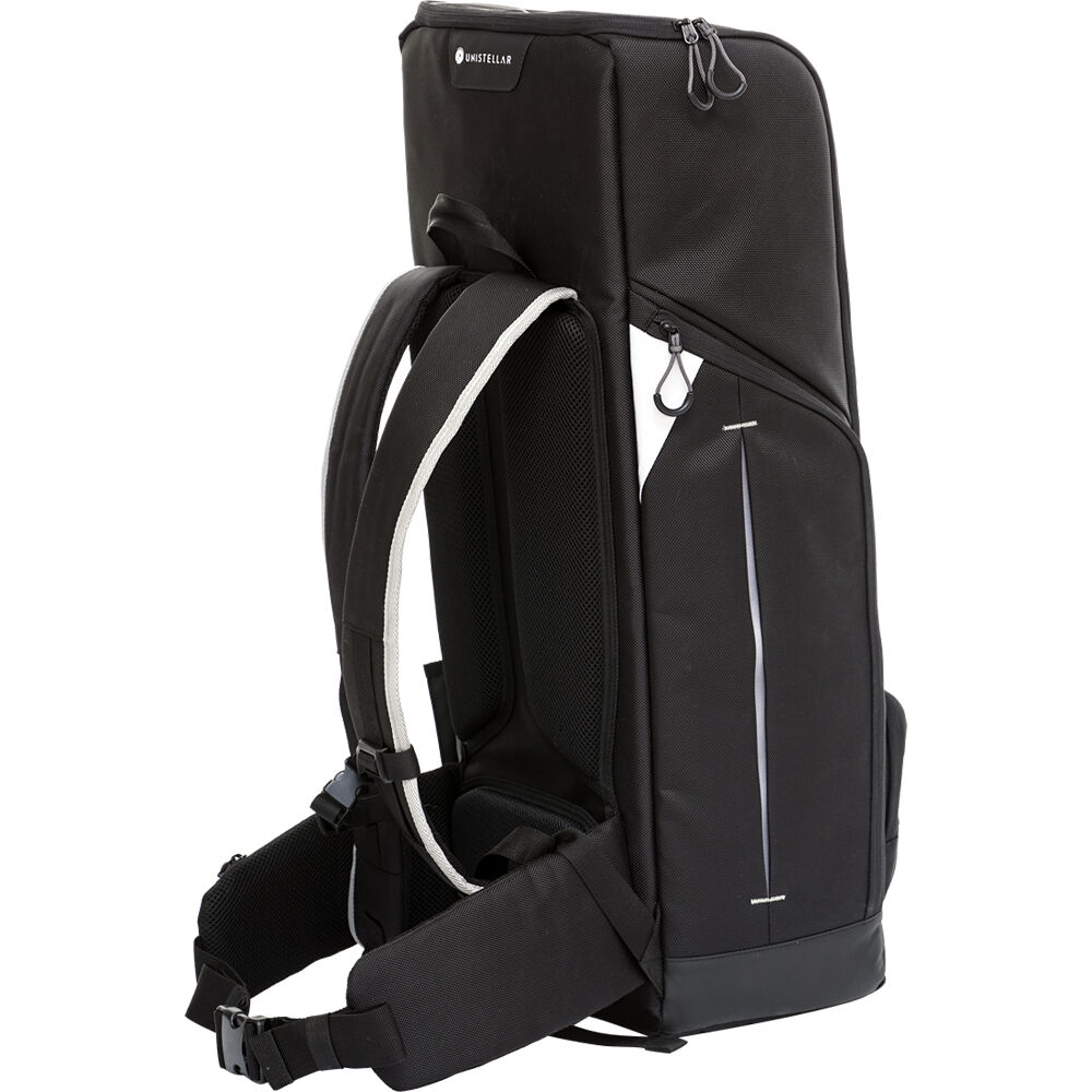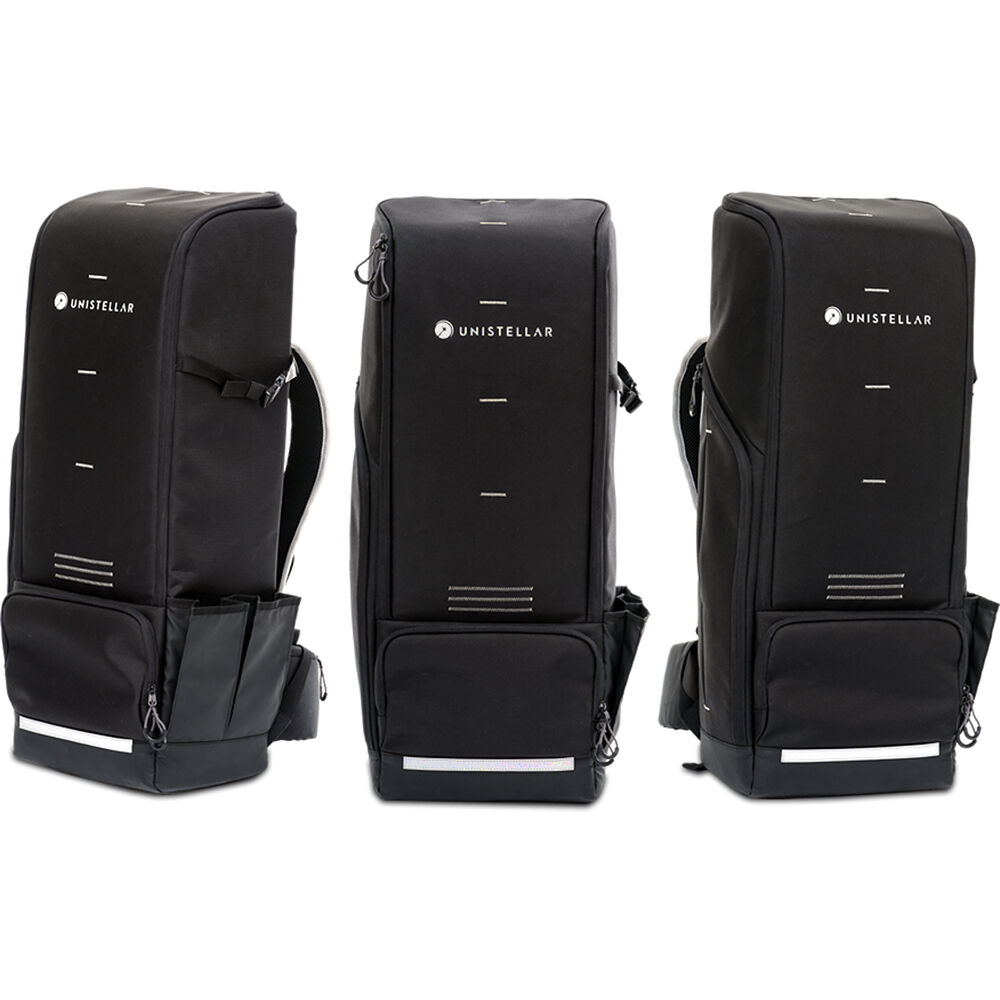 This Telescope Backpack is custom built for Unistellar eQuinox and eVscope 2 models. It features padded adjustable shoulder straps and a hip belt along with a ventilated back panel for comfort. Built-in inserts and an internal strap hold your telescope securely while in transit. Five internal pockets, two with zippers, are provided for items such as the telescope cap and eyepiece lid. There are two large external pockets, plus one on the belt.