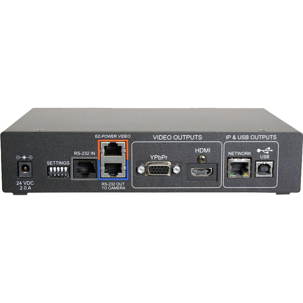 Connectors | 1 x RJ45, EZ-Power VIDEO on Shielded RJ45F 1 x RJ45, RS-232 on Shielded RJ45F 1 x USB 2.0 on Type-B Female 1 x 5.5 mm OD x 2.5 mm ID Coaxial Connector at 24 VDC, 2.0 A |