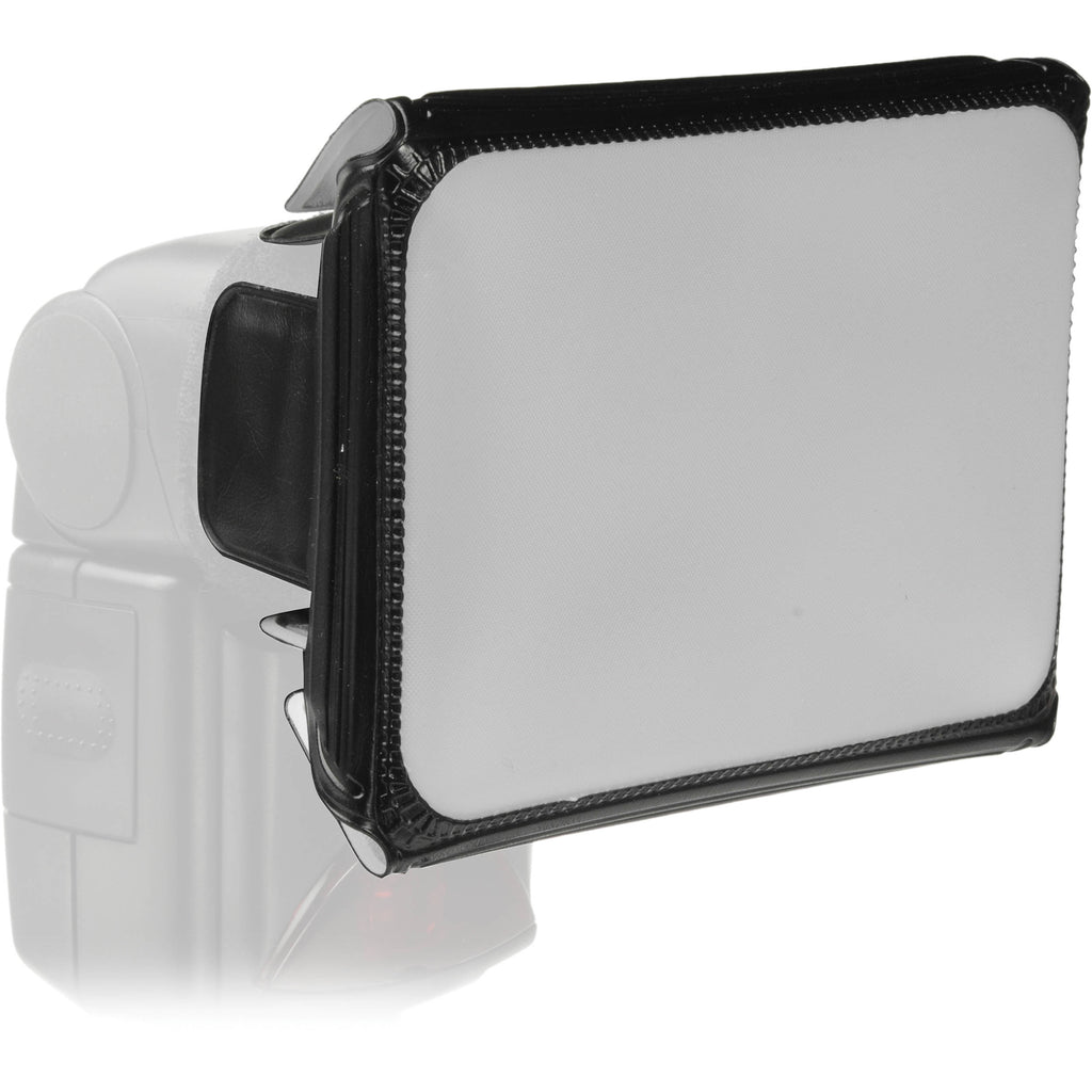 Soften and diffuse the light from your shoe-mounted flash unit by using this small Vello Universal Softbox Kit from B&H that also includes six Colored Gels and a Cinch Strap . The softbox easily attaches to a flash head using the cinch strap and will soften shadows and hot spots. Also, it folds flat for easy storage.