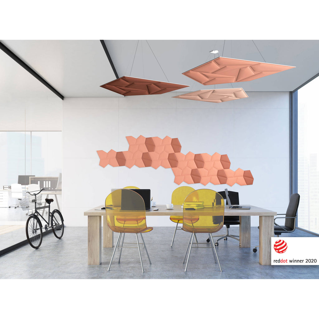 The green 3 Vicoustic GEN_VMT PENRAY 01 Cloud is a generative structure that allows you to create a set of combinations that not only optimize the acoustic environment but also add aesthetic values to any space. The first set of clouds from the GEN_VMT collection, winner of the Red Dot Product Design Award 2020, raises the bar to a higher level. Sustainable and extremely durable, it can significantly reduce excess noise in various settings, adding an innovative interior design asset to an architectural project. Plus, being a suspended acoustic element, it presents twice the area of absorbing material exposed next to a common acoustic panel.