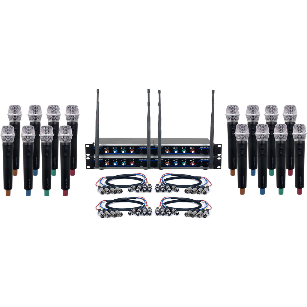Featuring sixteen handheld microphones, the Hybrid-Acapella-16 wireless system from VocoPro combines the convenience of simple set up & easy operation with the signal quality of 24-bit digital technology. It operates free from TV signal interference in the 900 MHz band with a transmission range of up to 200', and is well suited for groups of singers or speakers on stage, in houses of worship or event halls.