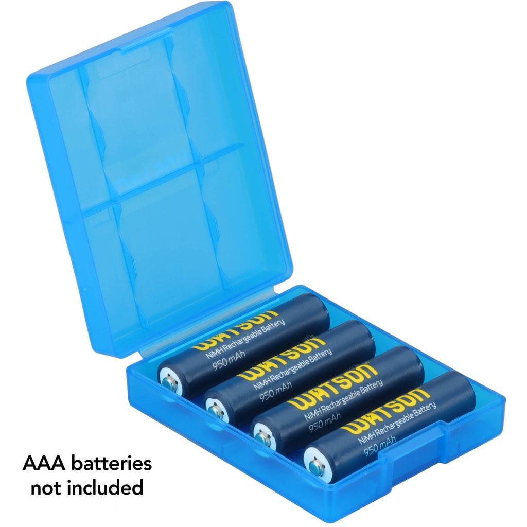 This blue Battery Case from Watson protects and stores up to four AA or AAA batteries. The small, portable case easily holds spare batteries and keeps them organized in your coat pocket or a small bag. This case keeps your spare batteries protected against unwanted contact, dust, and moisture.
