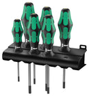 6-piece screwdriver set with Kraftform handle for pleasant, ergonomic working that prevents blisters and calluses. TORX® BO screws have a protruding pin in their drive profile. This prevents any unauthorised loosening since the "normal" hex tools cannot move these screws. Only special TORX® BO tools have a bore hole which can slip over the pin. The Wera Black Point tip and a complex hardening process ensure a long service life of the tip, enhanced corrosion protection and an exact fit. The hexagonal anti-roll feature prevents any bothersome rolling away at the workplace. Handle markings for simplified finding and sorting of the tool. Includes a practical rack for tidy storage of the screwdrivers