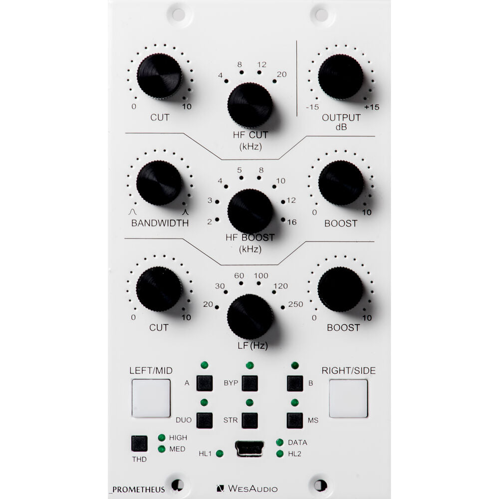 Merging the best of analog and digital worlds, the WesAudio _PROMETHEUS 500 series two-channel passive EQ offers classic Pultec-style equalization and the powerful luxury of digital total recall. On the analog side, it provides high headroom of +24 dBu and two-stage THD coloration for big tone that'll help you get pro impact in your tracks, mixes, and masters. Plus, there's true bypass and hardware A/B switching so you can easily compare dry versus EQ'd or two different configurations of settings.