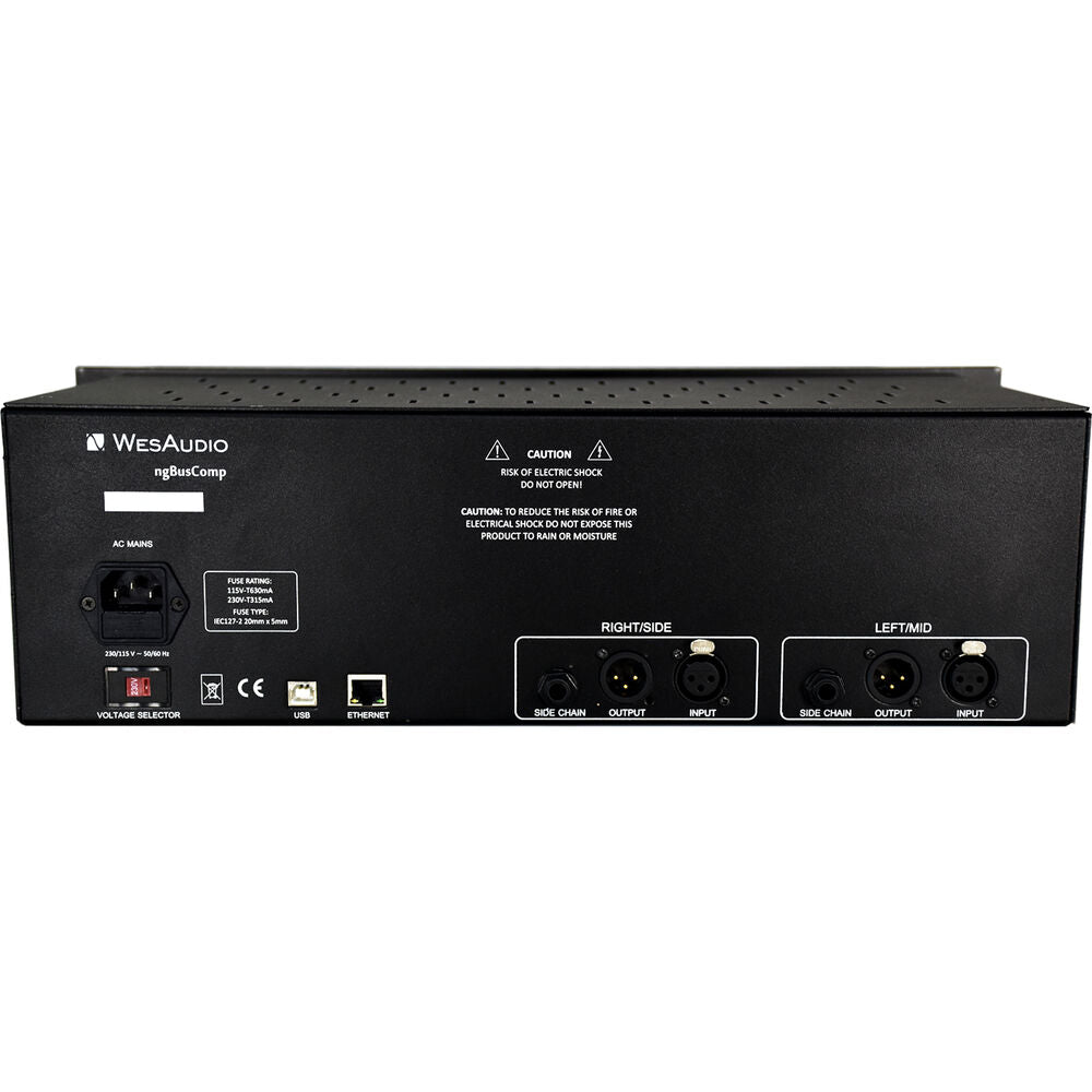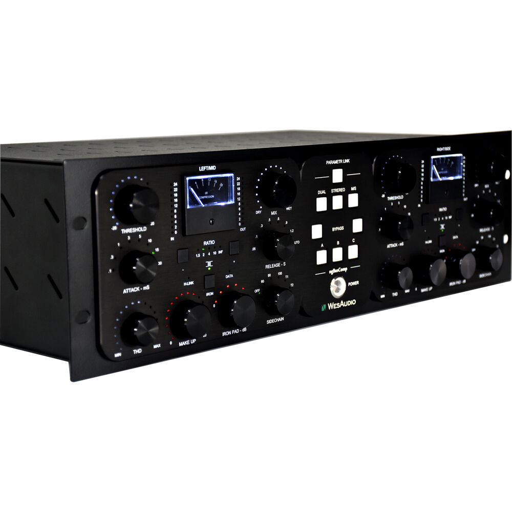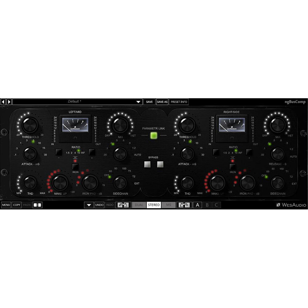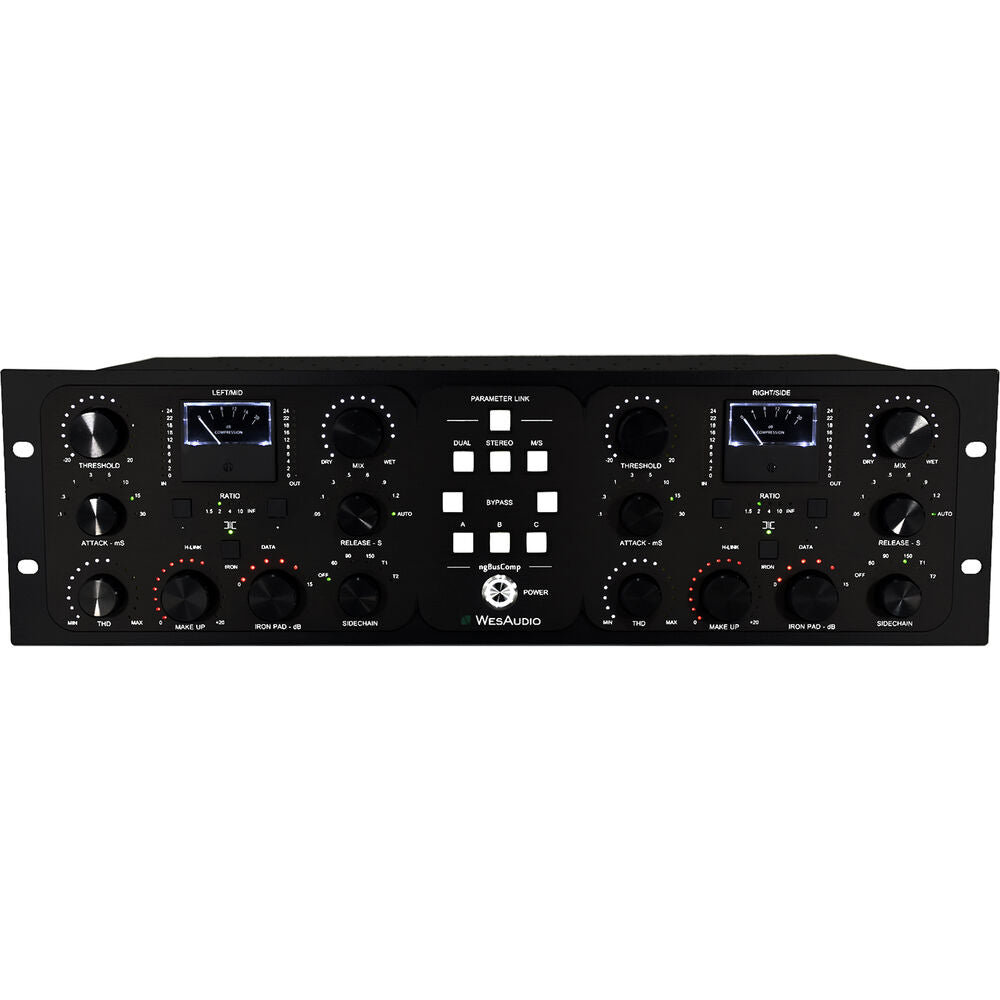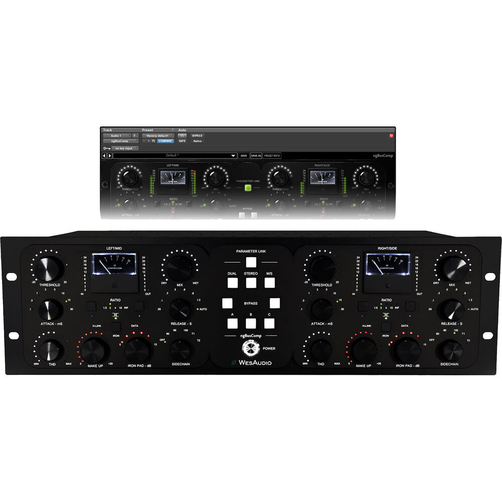 Merging the best of analog and digital worlds, the WesAudio ngBusComp rackmount stereo bus compressor offers legendary mix bus glue, three operating modes (stereo, dual mono, and mid-side), and the powerful luxury of digital total recall. On the analog side, it provides high headroom of +26 dBu, THAT 2181 VCAs, Carnhill transformers, variable parallel compression, and adjustable THD coloration intensity for big tone that'll help you get pro impact in your mixes and masters. Plus, there's true bypass and hardware A/B/C switching, so you can easily compare dry versus compressed or three different configurations of settings.