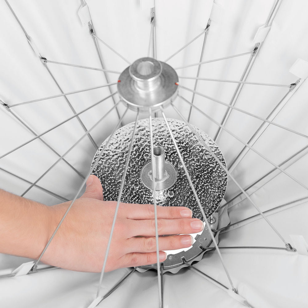 As the name "Switch" hints, Westcott has introduced a line of modifiers designed for rapid setup and swapping out of different brands of strobes and speedlights in seconds. The 24" Beauty Dish Switch is a good choice for full portraiture, fashion, or work on the road. The problem with metal beauty dishes has always been transport and the large, unwieldy cases used to protect them from dings and dents. Westcott gets around all that by giving the dish a lightweight (1.9 lb), collapsible design that opens and folds down in seconds like an umbrella. The modifier has a taught silver interior that adds a bit of snap to the contrast and maximizes your light sources output. The Beauty Dish Switch has all the advantages of rigid dishes � that signature soft but crisp quality of light that is very kind to hair, fashion, make-up, and simple portraiture. Another benefit is the reflection of natural-looking catchlights in your subject's eyes.