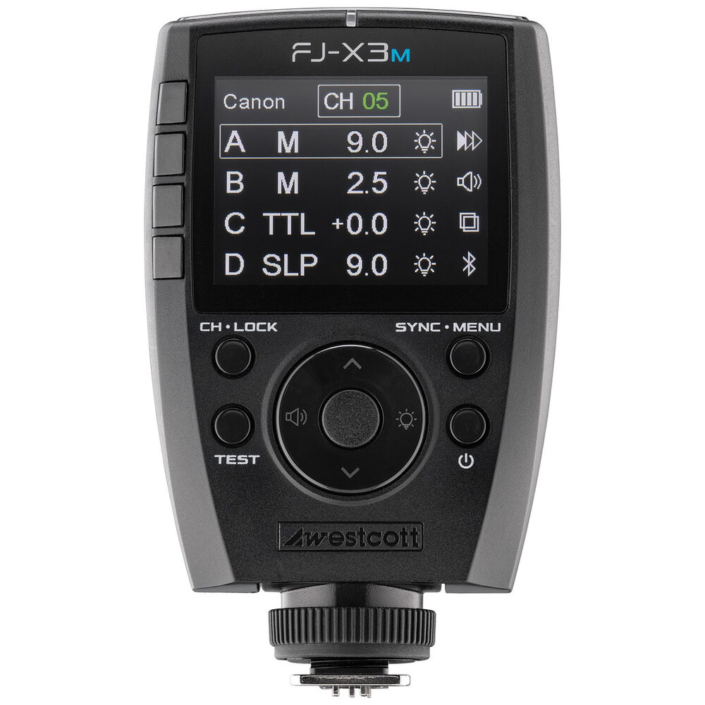 The Westcott FJ-X3 M Universal Wireless Flash Trigger is equipped with multi-brand technology that pairs with most camera brands to trigger the FJ Wireless and Canon RT devices. This 2.4 GHz remote offers revolutionary compatibility with many Canon, Nikon, Sony (with adapter), FUJIFILM, Panasonic Lumix, and Olympus cameras. The FJ-X3 M mounts to a camera's hot shoe to wirelessly control multiple FJ400s, FJ200s, FJ80s, FJ-XR receivers, or Canon RT devices. Get reliable wireless connectivity up to 985' with enhanced performance in high-interference locations like weddings and events. It runs on a long-lasting removable lithium-ion battery. The FJ-X3 M is designed with a large display, user-friendly menu, and multi-select control pad for making quick adjustments. Functions include TTL, High-Speed Sync, Front and Rear Curtain Sync, Canon RT flash compatibility, group and channel assignment, Group Exposure Compensation, TTL to Equivalent Manual, modeling lamp settings, and much more.