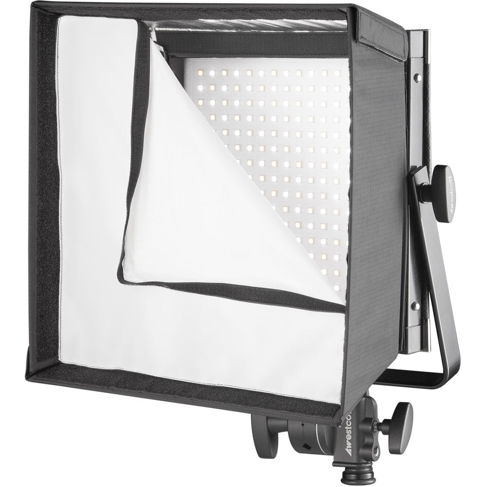 The Flex Cine Softbox 1 x 1' from Westcott attaches to the optional Westcott 1 x 1' Scrim Jim Cine Frame to let you direct and diffuse Flex 1 x 1' LED mats. It secures to the Scrim Jim using integrated industrial-grade hook-and-loop strips, and it also supports an included diffuser or optional Westcot softbox eggcrate grid via hook-and-loop strips on the front. Designed to collapse flat for transport, the softbox can be carried in bags, cases, and luggage.