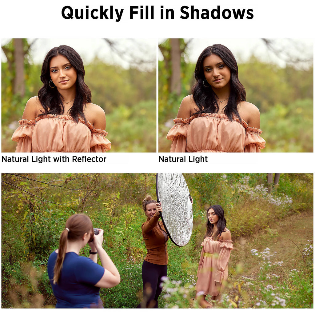 - Gold reflector simulates golden hour glow and adds warmth with a hint of contrast