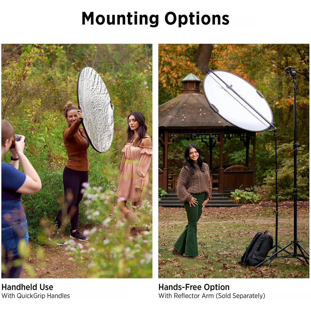 The reflector, which features a pair of QuickGrip handles for easy positioning, pops open for quick set-up and folds down to a third of its size to fit in the included carrying case. Built with double-layered fabrics and a steel frame, the Illuminator is made to withstand frequent use.