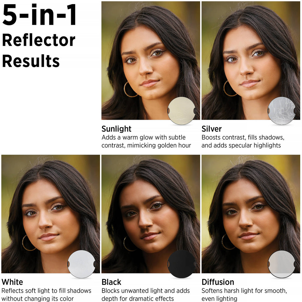 - Gold reflector simulates golden hour glow and adds warmth with a hint of contrast