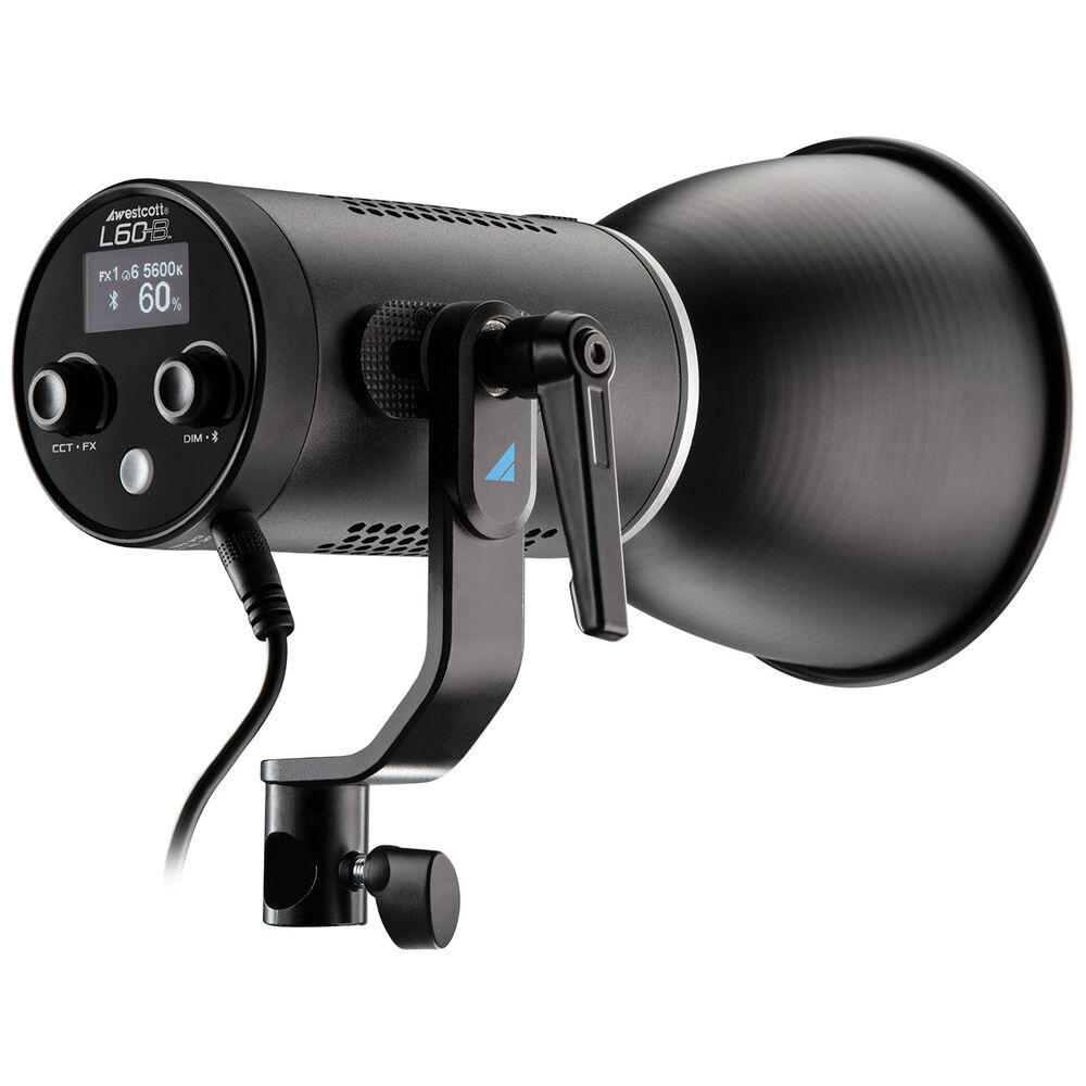 Among its many benefits are nine onboard special effects including lightning, fire, TV screen flicker, faulty light bulb, pulse, paparazzi flashes, headlights, SOS, and emergency lights. The L60-B runs on universal 100-240 VAC current, but it can also be powered by separately purchased D-tap or BP-F batteries when AC power is unavailable. Included with the L60-B COB LED are a removable yoke, an AC adapter, a 45° Ultra Reflector, a protective COB cover, a Rapid Box Switch insert (Westcott Mini), and a case.
