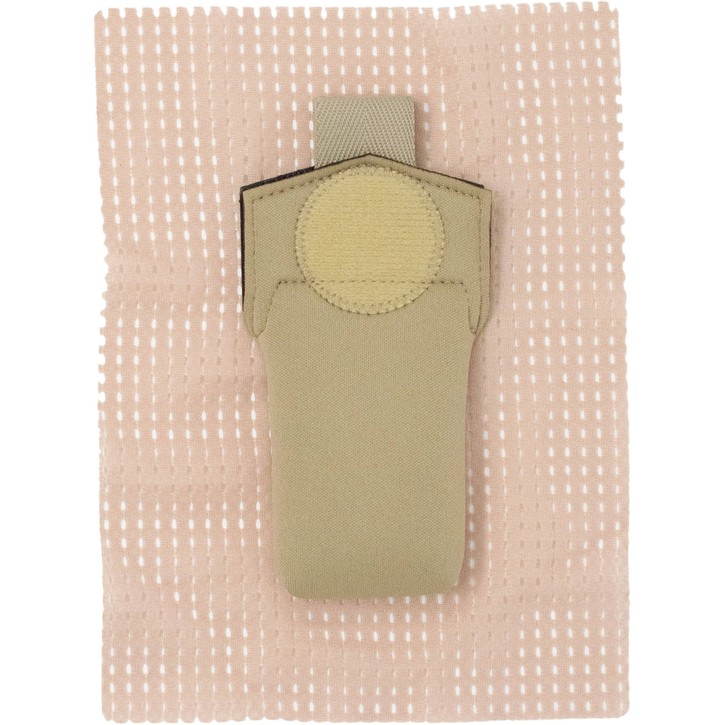 The tan Wireless Mic Belts Sew-In Pac for Q5X PlayerMic-S Transmitter is a custom holder designed to fit a Q5X PlayerMic-S wireless bodypack transmitter and conceal it for stage and screen purposes. Used in performance situations, which do not allow for an elastic belt, the holder features a strong, lightweight, athletic knit fabric panel that can be sewn securely into any garment, washed in place, and removed for reuse.