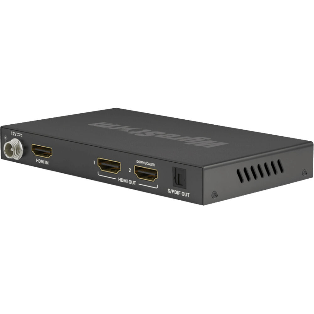 The WyreStorm Essentials 8K60 1:2 HDMI Splitter packs a punch as it is a powerful plug-and-play 8K HDMI splitter that has the ability to send uncompressed up to 8K 60 Hz or 4K 120 Hz up to two displays. The most useful feature of this splitter is that the second output can scale content down from either 8K to 4K or 4K to 1080p.