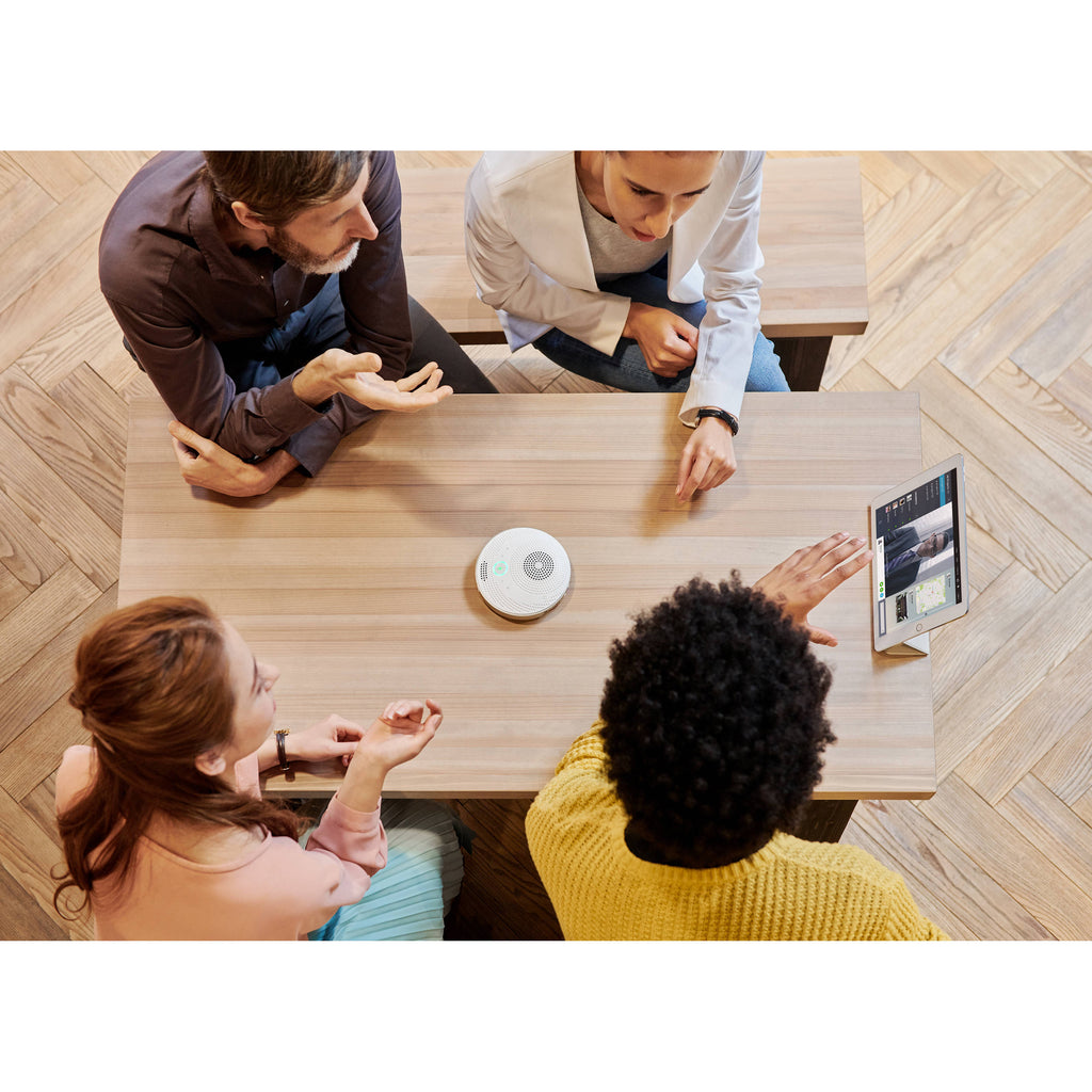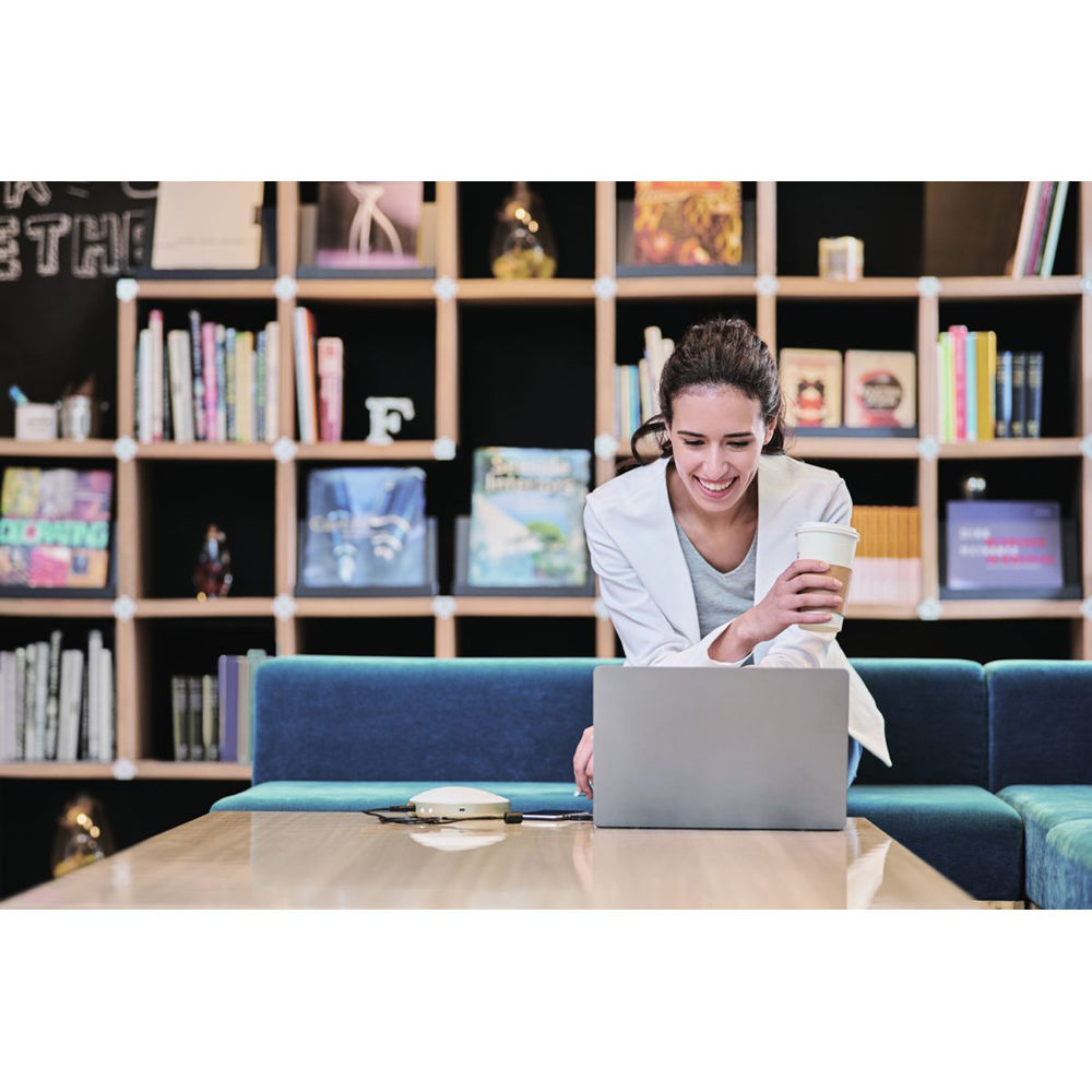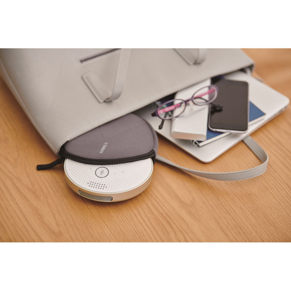 NFC pairing makes connecting multiple devices an easy process. You can also connect your headphones into its 3.5mm jack and listen privately through the speaker. Suitable for open workspaces, home offices, and travel use, the YVC-200 has a built-in rechargeable battery that lasts up to 10 hours for Bluetooth use, and longer over USB.